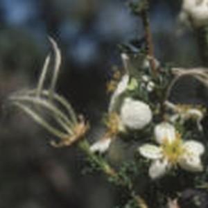 Close-up of small white flowers in bloom alongside a plume in the early stage of development.