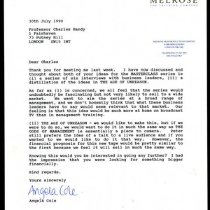 Letter of correspondence from Angela Cole to Charles Handy concerning Handy's project for the Masterclass series - a series of six interviews with business leaders and a summary of the ideas in "The Age of Unreason". Cole states that Melrose Film Productions thinks Handy's series is fascinating but unlikely to sell to a wide market. Cole goes on to reveal that MFP would prefer to handle "The Age of Unreason" the same way that "The Gods of Management" was processed.