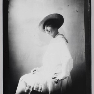 A three-quarters length seated studio portrait of Charmian London wearing a light colored dress and a hat tipped at an angle. She is turned to the left and has her left hand on her hip. Title devised by cataloger, date and location based on an inscription on another copy of this image, JLP 130. Two copies.