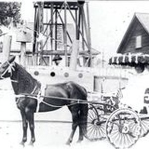 Picture of Mr. & Mrs. J. F. Miller and May Hudspeth in decorated buggy with horse. Mr. Miller is holding horse bridle. Woman in background behind fence with hat. July 4th circa 1906-10. Picture was donated by Harold Miller, son of Mr. & Mrs. J. F. Miller. Information handwritten on back of photo.