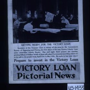 Getting ready for the Victory Loan. Secretary of the Treasury Glass is taking off the press in the Government Bureau of Engraving and Printing the first sheet of the new Victory Liberty Loan notes (short-time Liberty Bonds). Day and night these presses are running, printing billions of dollars' worth of these gilt-edged government securities, which are to be sold to the people from April 21st. to May 10th. Be ready to buy your share! Prepare to invest in the Victory Loan