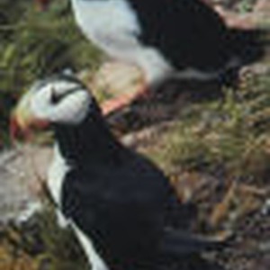 Close view of two horned puffins standing on rocks.