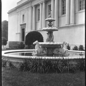 A view of the area immediately south of the library building, featuring the large, three-tiered fountain. The west entrance to the library is in the background, where the flanking statues have not yet been installed.
