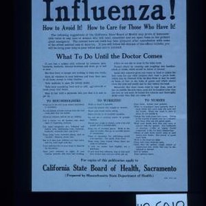Influenza. How to avoid it. How to care for those who have it ... What to do until the doctor comes ... to householders, to workers, to nurses ... For copies of this publication apply to California State Board of Health, Sacramento