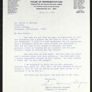 Louise Maxienne Dargans (Congress of the United States), 2181 Rayburn House Office Building, Washington, DC, letter, 1974 April 11, to Arenia C. Mallory (Saints College), Lexington, Mississippi. [Description English/roman)]