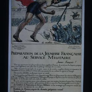 Preparation de la jeunesse francaise au service militaire. Jeunes Francais ! Vous qui appartenez aux plus prochaines classes appelees a l'honneur de servir sous les drapeaux, preparez-vous a tenir dignement votre place dans la phalange heroique de vos aines ... Enfants de France, espoir de demain, preparez-vous ! Soyez forts ! Assurez l'avenir de la race et la defense de la patrie !