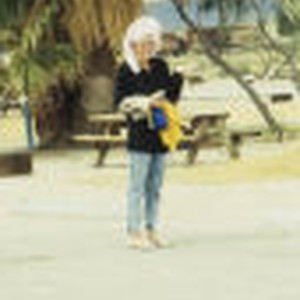Student Peggy Fastnow walking back from showers at Mecca Beach campground.