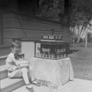 Photo--black and white, from Borba 8" x 10" celluloid negative: A child's birthday party with a young boy seated on a front step next to a table with a fort-like toy. The boy is holding a birthday cake. about 1920-30.
