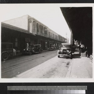 View of brick two-story buildings, with balconies, on Marchessault Street in Old Chinatown, Los Angeles, with automobiles. There are crates of vegetables in front of some storefronts and a meat market in the middle of the photograph. Title transcribed from photograph.
