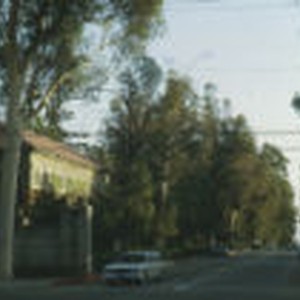 Shaded view of Sixth Street in Claremont. A couple of automobiles parked on the street with one car waiting at the stop sign.