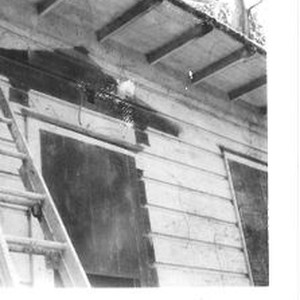 Photo--black and white: Burbank cottage before renovations--ladder under eves at front door. Background: After Luther died in 1926, Mrs. Burbank established an apple orchard on a portion of the Farm and leased the rest to Stark Bros. Nursery. When their lease expired in 1957 the property deteriorated and subsequently passed into new ownership. Local historians, intent on preserving the Burbank legacy in Sebastopol, formed the Western Sonoma County Historical Society in 1974. The cottage was placed on the National Register of Historic Places in 1978. The City of Sebastopol worked with the Society in its efforts to obtain 3 acres of the original farm and to restore the Cottage. Restoration began in 1983.