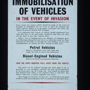 Immobilisation of vehicle in the event of invasion. Every owner of a motor vehicle should be ready, in the event of invasion, to immobilise his car ... Petrol vehicles remove distributor head ... Diesel-engined vehicles remove the injection pump and connection. Hide the parts removed well away from the vehicle