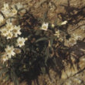 Close-up of long white flowers and dark green leaves in Cucamonga Canyon.