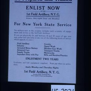 Be prepared and trained. Enlist now in the 1st Field Artillery, N.Y.G ... For New York State Service. No military unit in the country includes such a variety of equipment and service as the 1st Field Artillery. If you are physically fit, and between 18 and 45 years of age, you may enlist and specialize in any one of the following kinds of service which appeals to you. ... Enlistment two years. Uniforms and full equipment supplied