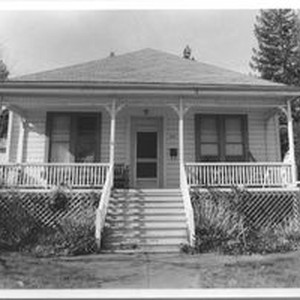 Photo, black and white: Sebastopol house at 456 South Main Street, Queen Anne cottage built 1895 in the Calder Addition. House photographed in 1993 by Evelyn McClure for her book "Sebastopol, California : History, Homes and People."