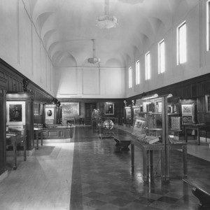 View of the library exhibition hall. Displays throughout the hall includes maps, books, and paintings. Stamp on verso reads "This photograph is made for the Huntington Library and Art Gallery by Keystone Photo Service, Los Angeles."