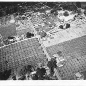 Photo--Black and white: Aerial photo of the Hallberg Graton home on Oak Grove Avenue at the bottom of the photo and surrounded by apple orchards. 1950
