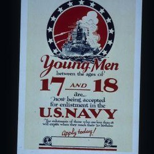 Young men between the ages of 17 and 18 are now being accepted for enlistment in the U.S. Navy. The enlistments of those who are less than 18 will expire when they reach their 21st birthday. Apply today!
