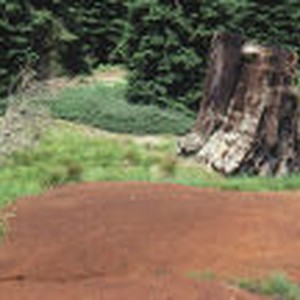 Piles of sawdust in front of a decomposing stump. These piles are located in the Big Stump Basin, a section of General Grant's Grove that was logged at one time. This grove, along with the rest of General Grant National Park, was added to Kings Canyon National Park in an effort to preserve this grove of giant sequoias.