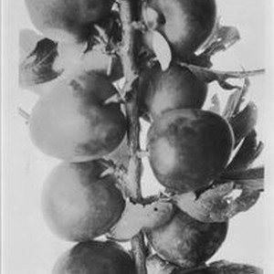 Photo--black and white: Tree branch with plums. Burbank "Elephant Heart" Plum. Labeled: "K-22 "Elephant Heart" Photographed 1928."