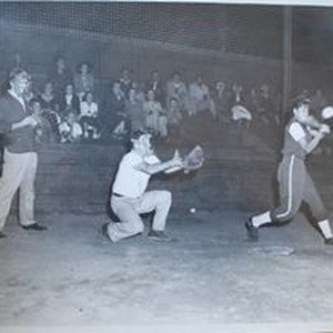 Photo--black and white: Sebastopol Lions Club scrapbook photo: Lions Club softball game circa 1955. The catcher is Joe Johnson. Photo by Sebastopol Times.