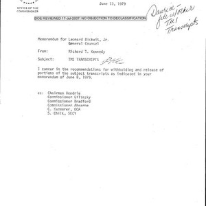 Image / R. T. Kennedy memo regarding Three Mile Island transcripts