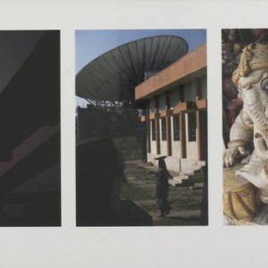 Triptych depicting, from left to right, a worm's eye view of people walking on beams of wood against a purple sunset or sunrise, a woman carrying a basket on her head in front of a building and large satellite dish, and a statue of the Hindu deity Ganesha in a room with a DishTV satellite dish antenna.