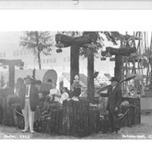 Photo--black and white, blow up of postcard: The Luther Burbank exhibit at the 1912 Gravenstein Apple Show. Burbank is seen at the right holding a spineless cactus on his shoulder. Another man and two women stand in the exhibit that is made of redwood stumps. Caption states: "Apple Show 1912 Sebastopol, Calif."