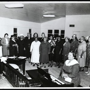 Photograph of "Haynes Chapel [crossed out], Tyler center: Mother Barron, Mother Ola Mae Haynes Mother Phillips (North Dallas District) 2nd from right Sis. Cline - first left Sis. Omega Sorrell - 2nd from left" -- written on back. No date. [Description English/roman)]