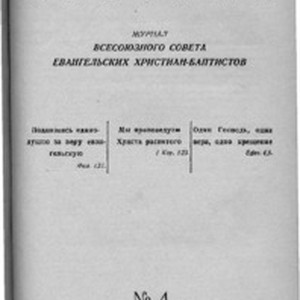 In 1945, The United Union of Evangelical Christians (EC) and Evangelical Christian Baptists (ECB) published the first issue of the Brotherly Herland. Iakov Ivanovich Zhydkov, chairman of the national (USSR) Union of Evangelical Christians and Baptists, became the chief editor. The editorial committee consisted of M.I. Golyaev, M.A. Orlov, and Alexander Vasi'yevich Karev. The leadership of the NUECB (all-National Union of Evangelical Christian Baptists) set the main task of the journal to form "Unity" in the midst of protestant churches of the moderate type. Thus, in the preface of the first issue of the journal it was stated, "The task of the Brotherly Herald is to work in such a way that unity might penetrate the bodies and blood of all brothers and sisters and become indestructible even going through tests and difficulties. May the Lord Himself make one united nation of two movements in His Name. Our mottos are the words from the Holy Scripture, they are dear to our hearts, 'We preach Christ crucified' (1 Cor. 1:23), 'Stand firm in one spirit, contending as one man for the faith of the gospel' (Phil. 1:27), 'One Lord, one faith, one baptism' (Eph. 4:5)". ❧ The second purpose of the periodical (which was to be published every other month) was to inculcate "correct training" of church members (correct from the spiritual as well as civic points of view). This purpose was successfully fulfilled by publication of texts of sermons, spiritually-edifying articles, official appeals and reports. The journal consisted of the following contents: 1. Religious and patriotic Evangelical Christians and Baptists and the Motherland. 2. Sermons and spiritual articles. 3. From history of the Evangelical Baptist movement in USSR. 4. From history of Christianity. 5. Biographies and necrologies of Evangelical Christians and Baptists. 6. Life and activity of NUECB. ❧ The address of the editorial office was in Moscow, Pokrovsky Boulevard, Maliy Vuzovsky Lane, 3. [Description English/roman)] В 1945 году объединенный союз ЕХ и ЕХБ издал первый номер периодического издания «Братский Вестник», главным редактором стал председатель Всесоюзного Совета евангельских христиан и баптистов Я.Жидков. В редакционную комиссию вошли Голяев М.И., Орлов М.А., Карев А.В. Основной задачей журнала руководство ВСЕХБ видело в формировании «Единства» среди протестантских церквей умеренного типа. Так в предисловии к первому номеру журнала писалось: Задача «Братского вестника» - так повести свою работу, чтобы дело единения вошло, в плоть и кровь всех братьев и сестер, чтобы оно стало нерушимым даже при испытаниях и трудностях, и чтобы теперь уже Сам Господь соделал из двух течений один народ во имя Свое. Нашими лозунгами являются дорогие всем нам слова Св. Писания: ‹Мы проповедуем Христа распятого› (1 Кор. 1, 23) ‹Стойте в одном духе, подвизаясь единодушно за веру евангельскую› (Фил. I, 27) ‹Один Господь, одна вера, одно крещение› (Ефес. 4, 5)». ❧ Вторая цель этого периодического издания которое планировалось издавать один раз в два месяца было прививать «правильное воспитание» членов церкви «как с духовной, так и с гражданской точки зрения» . Данная задача достаточно успешно выполнялась посредством публикации проповедей, духовно-назидательных статей, официальных обращений и отчётов. Журнал состоял из следующих рубрик: 1. Религиозно-патриотический Евангельские Христиане и Баптисты и родина. 2. Проповеди и духовные статьи. 3. Из истории Евангельско-Баптистского движения в СССР. 4. Из истории Христианства. 5. Биографии и некрологи Евангельских Христиан и Баптистов. 6. Жизнь и деятельность ВСЕХИБ. 7. Жизнь общин на местах. 8. Корреспонденция. ❧ Адрес редакции находился в г. Москве, Покровский бульвар, Малый Вузовский пер., дом. 3." [Description (original non-English/roman language/script)]