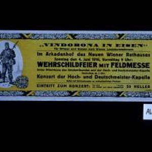 "Vindobona in Eisen." Fur Witwen und Waisen nach Wiener Landsturmmannern. Im Arkadenhof des Neuen Wiener Rathauses ... Wehrschildfeier mit Feldmesse