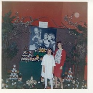 Donna Hallberg (Hallberg-Marovich and Kathie Hallberg , 1964 in front of Hallberg Apple Ranch display at the Gravenstein Apple Fair with enlarged photo of them with Gene Bologna, Sonoma County Sealer of Weights & Measures, weighing the large Hallberg apple