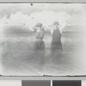 Elizabeth and Jack London wearing bathing suits stand in water with their hands behind their heads. Title and date transcribed from envelope. Copy print of original. Image is the same as JLP 164.