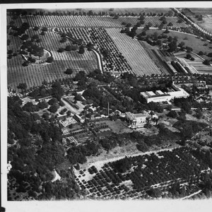 The Huntington residence and library building are visibly, as well as the rose garden and arbor. The label that accompanies this photo in the album reads "No. 111 Aerial photo of north section of the estate, about 1921." Numerous ms notes on the verso, including "Spence Air Photos, 2404 West Seventh St., Fitzroy 2948, Los Angeles, Calif."