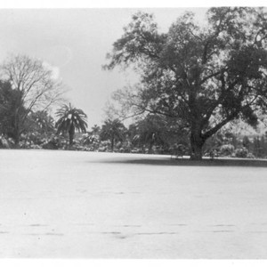 Tiny snapshot of an area of the lawn to the east of the residence after a rare southern California snowfall. MS note on verso reads "Jan. 15, 1932." MS notes on envelope say "Snow pictures at Huntington Library Jan. 15. 1932" and "from: Maurice Block estate, 1966."