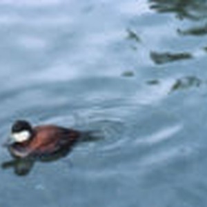 Close-up of male red and black duck in a pool of water.