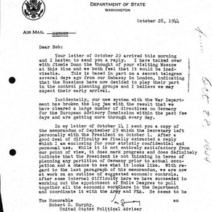 Image / H. Freeman Matthews letter to Robert Murphy regarding visit to Moscow