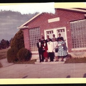 Packet 18: photograph of 9 unidentified people standing on the steps in front of Saints Industrial School cafeteria, Lexington, Mississippi, [s.d.]. [Description English/roman)]