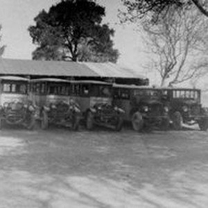 Photo--black and white, from Borba 8" x 10" celluloid negative: Circa 1925, a fleet of five Analy Union High School buses lined up in front of a garage building.