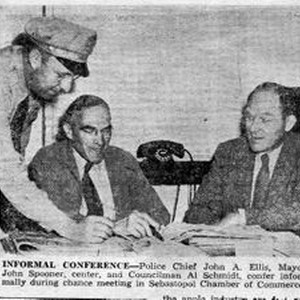 Photo--black and white: From Empire section of the Press Democrat, Sunday July 18, 1948: L-R: Sebastopol Police Chief John A. Ellis, Mayor John Spooner and Councilman Al Schmidt meet at Sebastopol Chamber of Commerce.