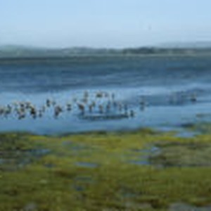 A small flock of Godwits stand in the tidal flats with hills and mountains in the background.