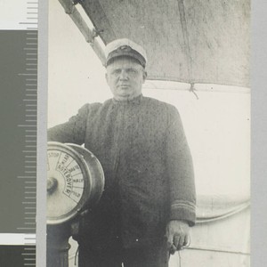 Ship captain stands on bridge of ship next to ship's engine order telegraph. Title and date transcribed from envelope. Includes one duplicate photograph.