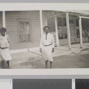 Two Hawaiians stand outside of a home with a long porch.