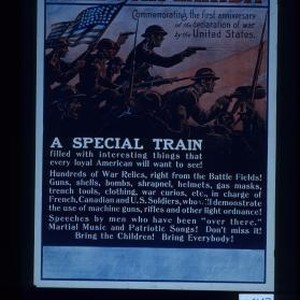 Free War Exhibit commemorating the first anniversary of the declaration of war by the United States. A special train filled with interesting things that every American will want to see. Hundreds of war relics, right from the battle fields!