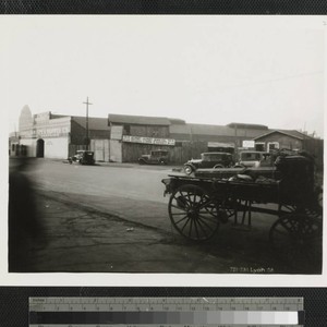 View of Familian Pipe & Supply Co. and Alpert & Alpert Junk Co. buildings on Lyon Street near Old Chinatown in Los Angeles. There are automobiles on the street and in front of the junk business and a wagon in the foreground. Los Angeles City Hall is in the background. Title transcribed from photograph.