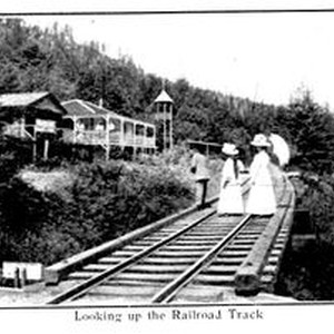 Print--black and white: Postcard booklet photos of Monte Rio on the Russian River, California circa 1900s. Caption: "Looking up the Railroad Track"