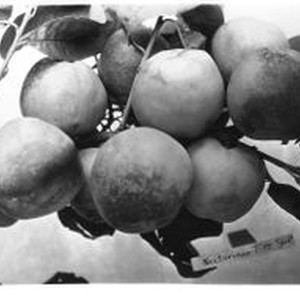 Photo--black and whtie: Identification of Luther Burbank nectarine hybrid from the Gold Ridge Experiment Farm. Nectarine branch, indentified on back as "Necterine T-45 (E.T.) yellow gold branch Photographed Aug. 1929."