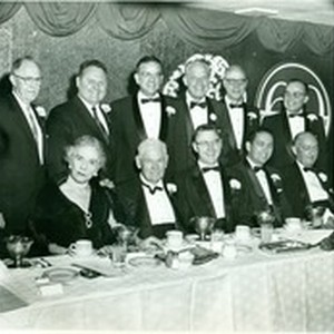 Mr. and Mrs. Whitsett at formal dinner; nine unidentified men.