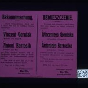 Bekanntmachung. ... die russischen Staatsangehorigen ... sind zum Tode verurteilt worden, weil sie Schusswaffen besessen ... Lodz, den 4. Marz 1916. Der Militargouverneur: Barth, Generalleutnant. Obwieszczenie. ... Gubernator wojenny Barth, general-porucznik