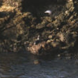 A sea lion sitting at the bottom of a cliff that is next to the water.